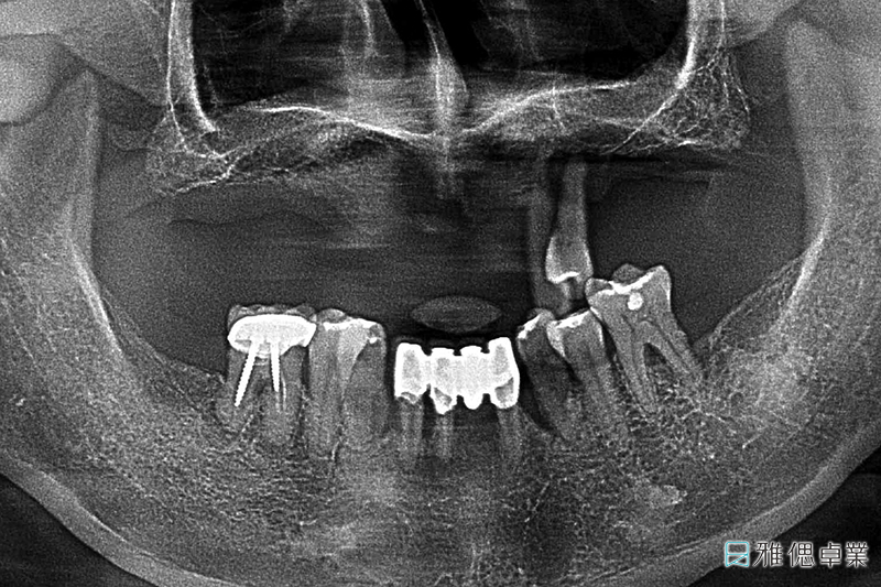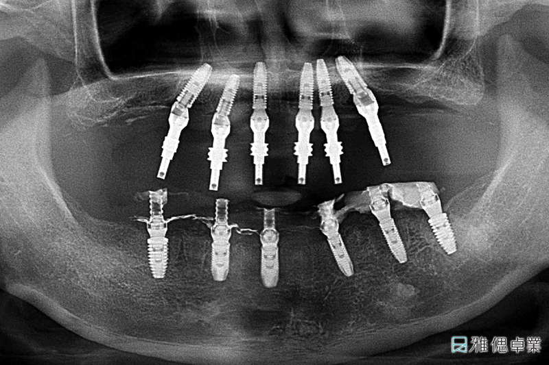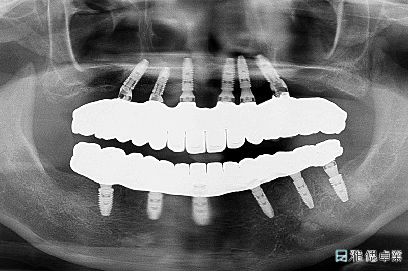 術前環口X光片,上顎只剩下2顆牙齒,下顎也有牙周、排列、咬合等問題