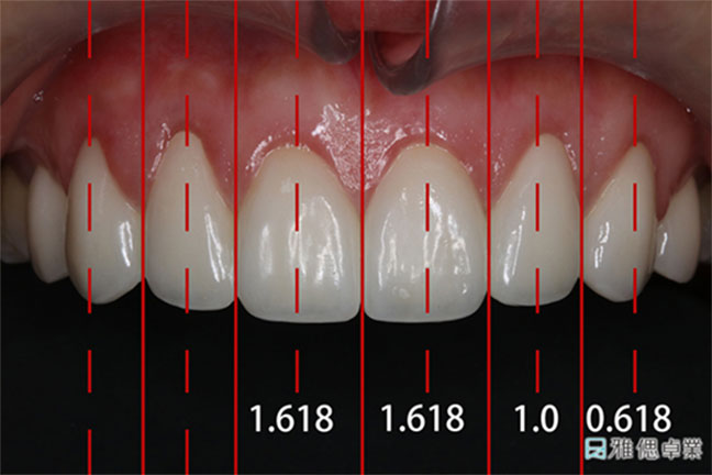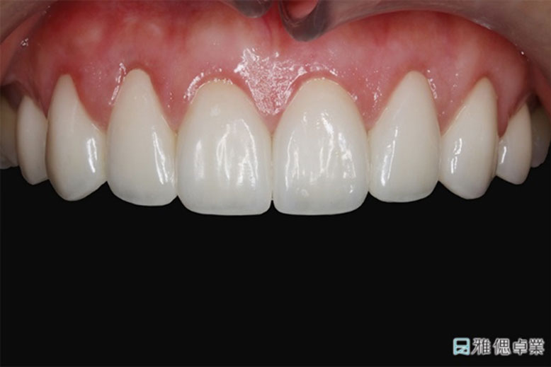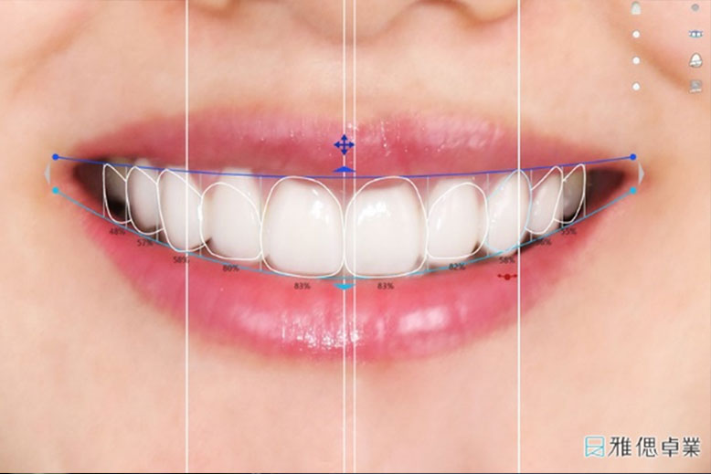 因此雅偲卓業的牙醫師會幫患者設計「專屬微笑曲線」,讓患者笑起來的嘴形呈半月形,當上排牙齒下緣與下唇上緣一致、上排牙齦連線與上唇下緣平行,就是公認的牙齒笑線標準。