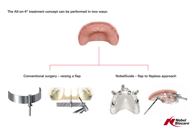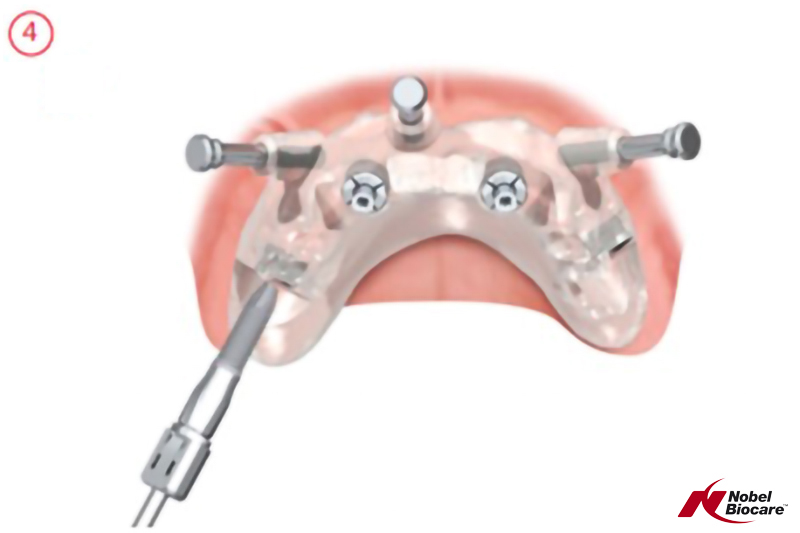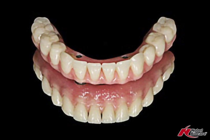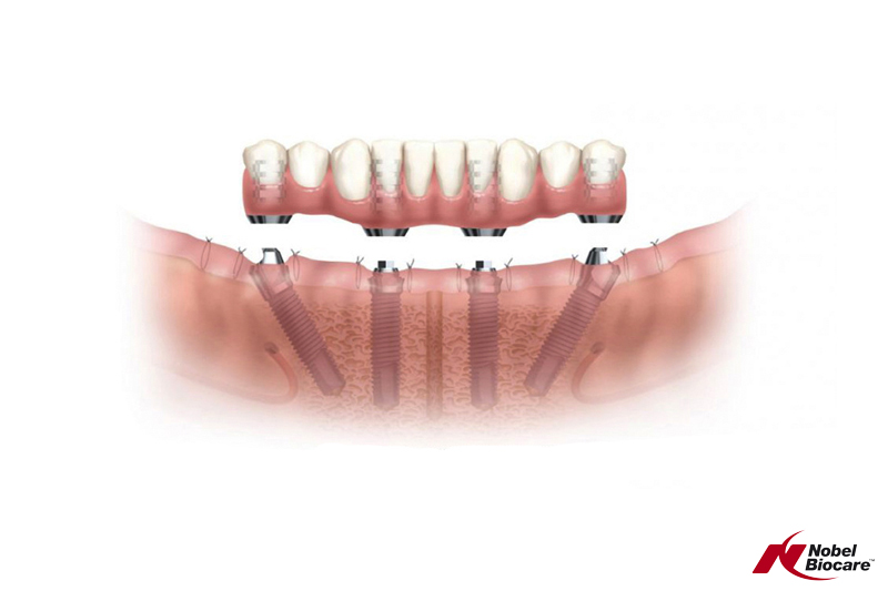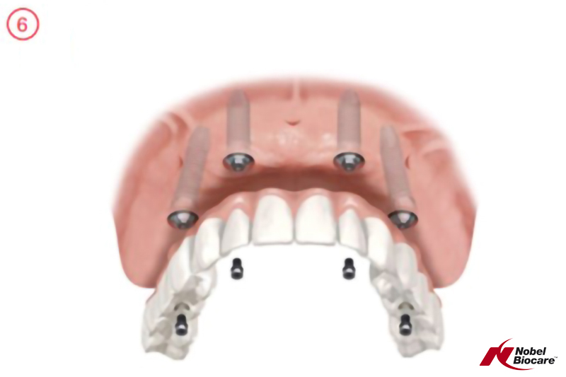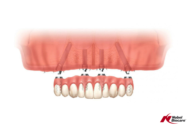 All-on-4®治療包括四個植入物,前側兩個直形植入物,後側兩個斜形植入物,它們可以支持臨時、固定立即加載的全牙弓假牙,可作為微創植牙的解決方案。