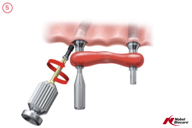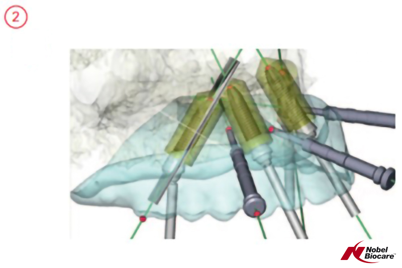 通過傾斜兩個後部植入物,可以使用更長的植體。這樣可以增加骨骼與植入物之間的接觸,並避免垂直的骨骼增大。此外,傾斜的植入物可以錨固在質量更好的前骨中,減少懸臂並有助於避免削磨重要的牙周組織。