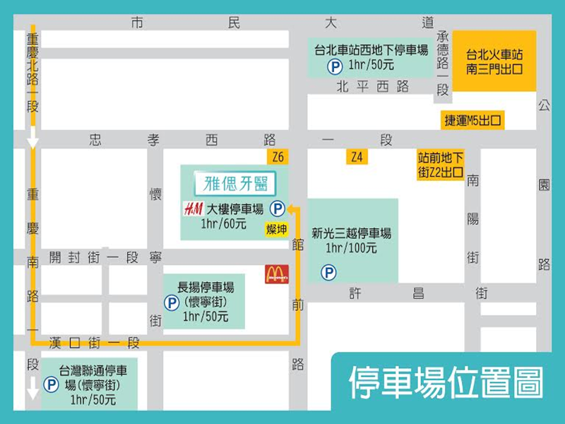 重慶北路交流道下,直走重慶北路一段與重慶南路口,左轉至忠孝西路,於懷寧街向右轉,於漢口街一段向左轉,於館前路向左轉,目的地於左手邊H&M台北站前店樓上6樓。